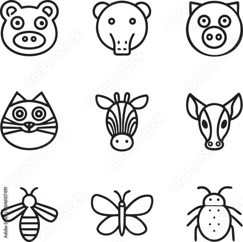 Set of cute animal face icons in line art