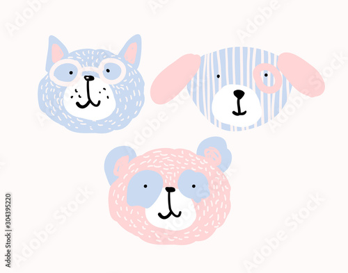 Set of cute animal faces in pastel colors. Portrait of a cat, puppy, panda in a flat style. Naive pet character. Sticker for children, blank for design cards, children s application. Stock vector