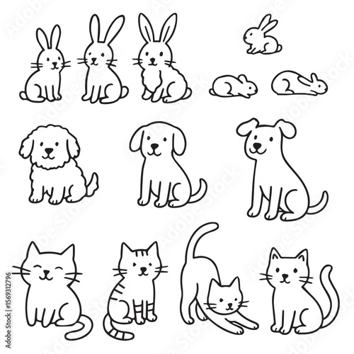 Set of cute animals in doodle style on white background. Hand drawn rabbits, dogs and cats in different poses. Vector