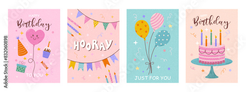 Set of cute birthday cards design with cake, balloons and party decorations. Vector templates great for poster, Invitations, banner, flyer
