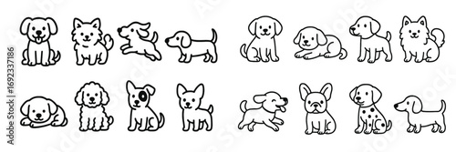 Set of cute cartoon dog icons in various breeds and poses, simple black and white line art collection for pets and animals