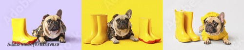 Set of cute dog in raincoat and with gumboots on color background