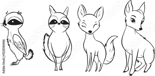 Set of Cute Forest Animals Black and White Vector Illustration Raccoon Fox Owl Deer Wildlife Woodland Creatures Nature Cartoon Characters Simple Line Art Drawing Childrens Book Illustration Nursery