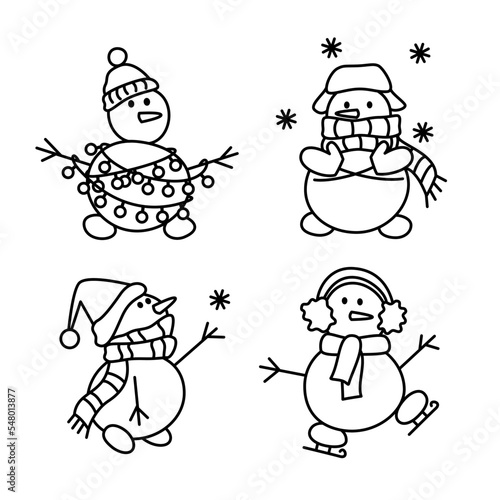 Set of cute funny snowman in doodle style. Snowmen in a hat, with a garland, snowflakes and skates.