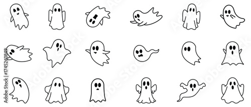 set of cute ghost outlined style. set of cute Halloween ghosts illustration design. Ghost illustrations with various expressions. The symbol of the Happy Halloween holiday. Vector illustration.