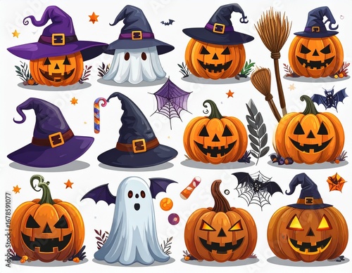 Set of Cute Halloween Icons with Jack-o'-Lanterns, Ghosts, and a Witch's Broom