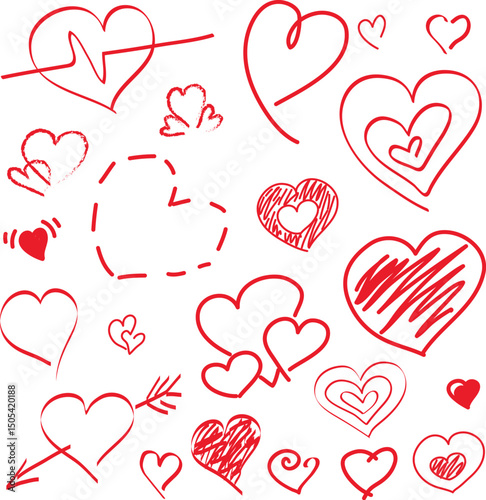 Set of cute hearts hand drawn with a red brush with curved outlines. Heart with pulse, heart with arrow, shaded heart, dotted heart, three hearts, heart drawn with brush