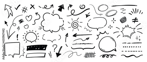 Set of cute pen line doodle element vector. Hand drawn doodle style collection of speech bubble, arrow, firework, star, heart. Design for decoration, sticker, idol poster, social media.