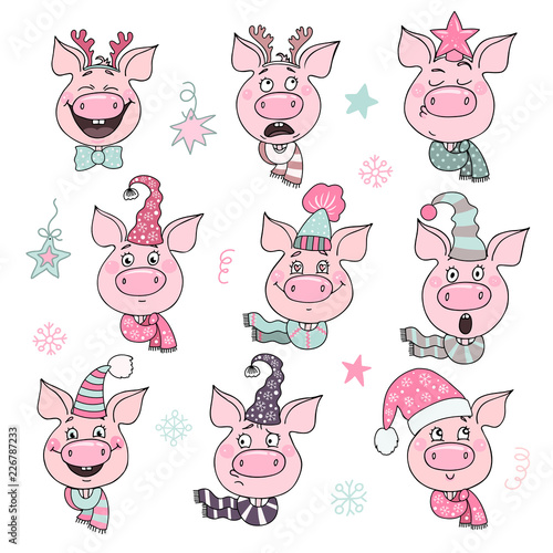 Set of cute pigs with emotions of joy and happiness