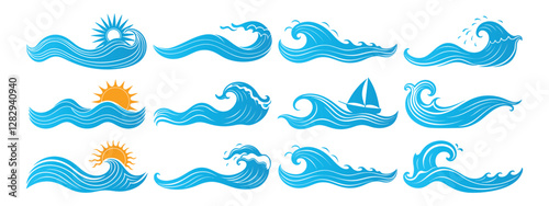 Set of decorative ocean waves with sun and sailboat in hand-drawn style
