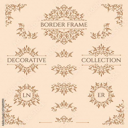 Set of decorative title borders, corners and monograms, frame. Graphic design page.