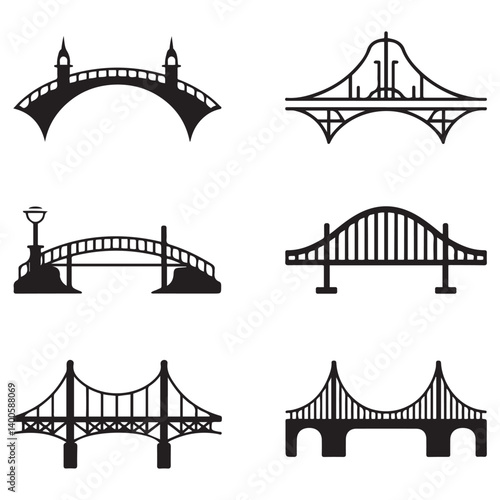 Set of different bridges. Isolated on white background. and white. Vector Black silhouettes. illustration.