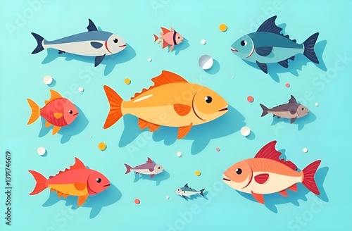 Set of different colorful sea fish on blue background. Sea animals. Marine life
