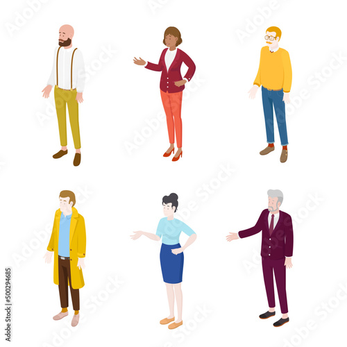 Set of different isometric people on white. Vector illustration flat design isolated. Male and female characters. Office and casual clothes