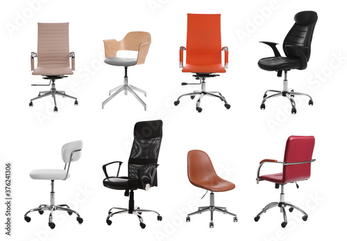 Set of different office chairs on white background
