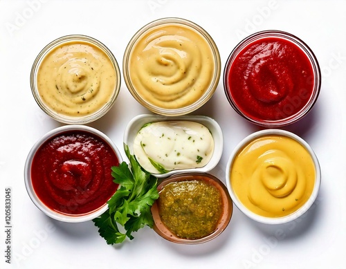 Set of different sauces isolated on white background, top view