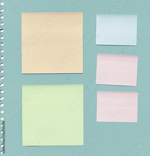 Set of different shape and color reminder notes on bright pastel paper background