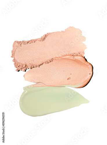 Set of different textures of cosmetic foundation, concealer, soft face powder bb or cc correcting cream anti-red on gray background