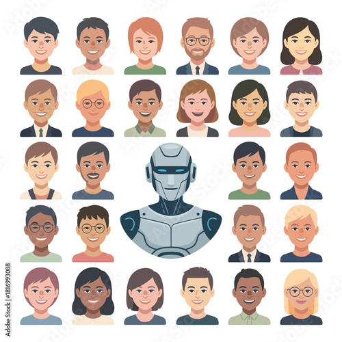 Set of Diverse People Avatars with Futuristic Robot Character in Vector Illustration