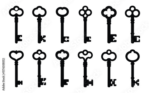 Set of Diverse Vintage Key Silhouette Icons Vector Illustration - Modern Security and Unlock Collection for Mystery, Access, and Decorative Design Elements