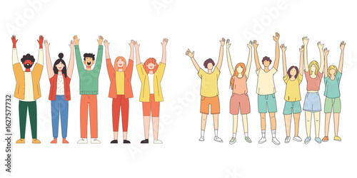 set of diverse young people raising hands and celebrating in flat illustration style