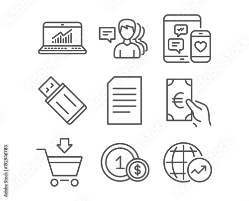 Set of Document, Online statistics and Finance icons. People, Usd coins and Online market signs. Usb flash, Social media and World statistics symbols. Information file. Computer data. Eur cash