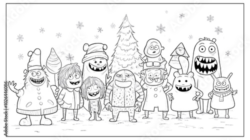 set of doodle cartoon characters color page, humor funny monster zombie winter Christmas halloween theme fun hand drawn black outlines for print for kids coloring sheet book