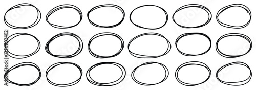 Set of doodle ellipses. Scribble ovals, bubbles to circle and highlight text. Pencil or pen graffiti bubble or ball draft illustration. Black paint marker circles. Vector illustrator