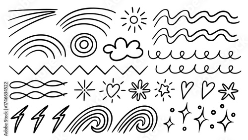 Set of doodle rainbows suns clouds waves lightning hearts stars and sparkles in black line art style.