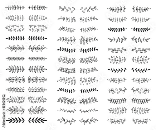 Set of doodles with laurel and floral text dividers. Branches, ornamental divider, borders, lines. Hand drawn vector illustration on white background
