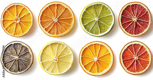 Set of dried citrus fruits isolated on a transparent background, top view.