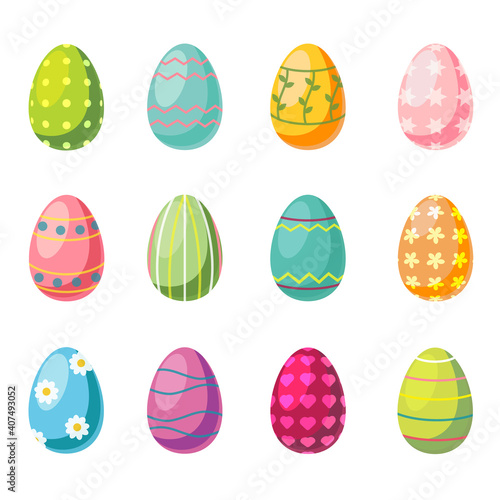 Set of Easter colored eggs isolated on a white background. Egg for a holiday with painted patterns of circles, lines, flowers. Spring festival. Vector illustration. Cartoon style. Happy Easter Eggs