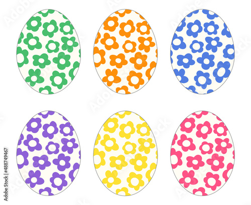 Set of Easter egg icons. Simple cartoon flat vector illustration with egg silhouettes with floral pattern print, isolated on white. Groovy and funky 60s, 70s style