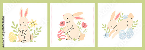 Set of Easter postcards posters with a white rabbit, flowers and Easter eggs. illustration template.