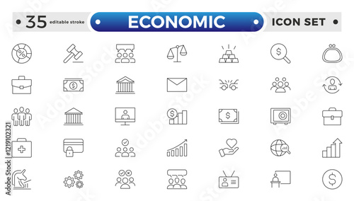 Set of Economic and Insurance line icons. Outline icon collections related to education, insurance, law, government, and more. graphs, charts representing market trends. Editable stroke outline icon.