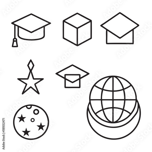 set of educational equipment (cap, globe , book, pen, pencil, light, apple, bulb, star) icon line art vector illustration on white background.
