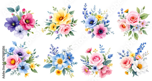 Set of eight colorful watercolor flower bouquets, isolated on a transparent background.