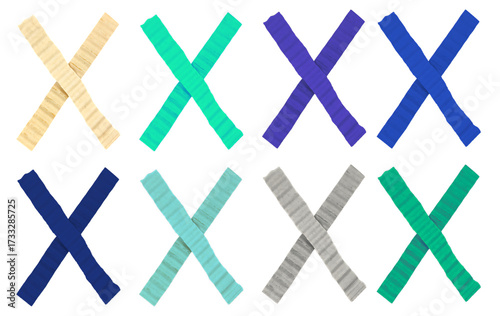 Set of Eight Corrugated Cardboard X Shapes in Various Colors Isolated on Transparent Background