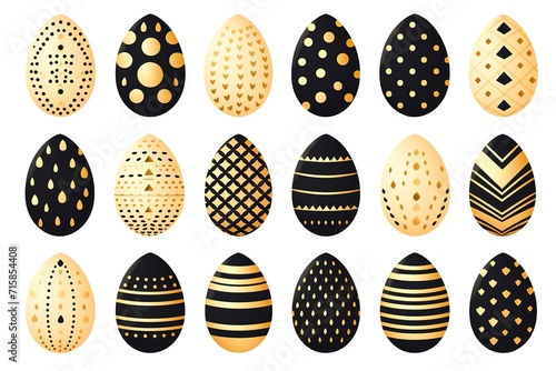 set of Elegant black and gold decorated Easter egg collection on a white background, a sophisticated take on holiday traditions.