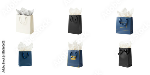Set of Elegant Gift Bags with Tissue Paper on White Background