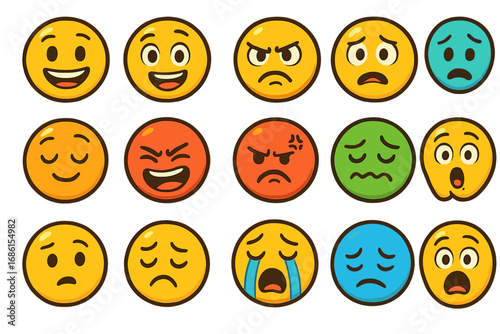 Set of emoticons. Emoji collection. Cartoon faces with different emotions. Smile, happy, sad, angry, funny character. Mood expression icon for social media. Vector illustration