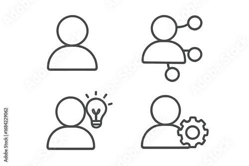 Set of faceless user icons with conceptual symbols for graphics and apps, including network connection, idea bulb, and settings gear, vector cartoon illustration with transparent background