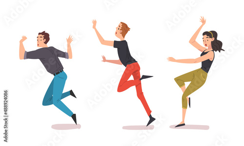 Set of falling people. Slipping men and woman with frightened face expression cartoon vector illustration