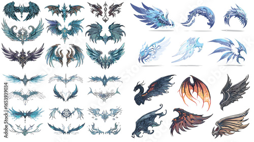Set of fantasy dragon and angel wings in tattoo and illustration styles. Ideal for gaming art, mythical design, and fantasy character concepts.