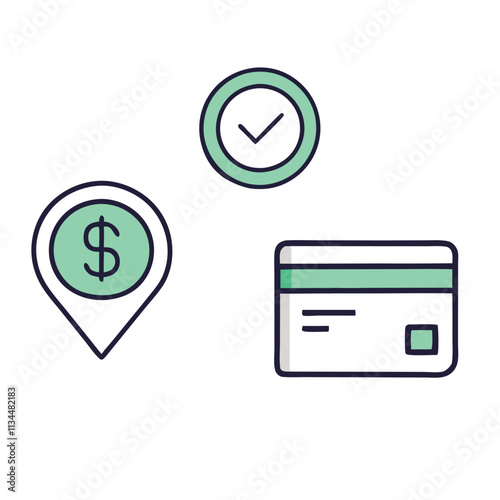 Set of financial icons including a credit card, dollar location marker, and checkmark in green and white on a white background. Flat style illustration for money and payment concepts