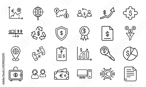 Set of Financial Technology and Currency Exchange Line Icons – Global Money Transfer, Forex Trading, Economic Security, Digital Payment, and Finance Management Symbols