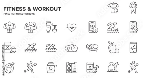 Set of fitness and workout outline icons. Pixel perfect editable stroke symbols for gym, sport, and wellness.
