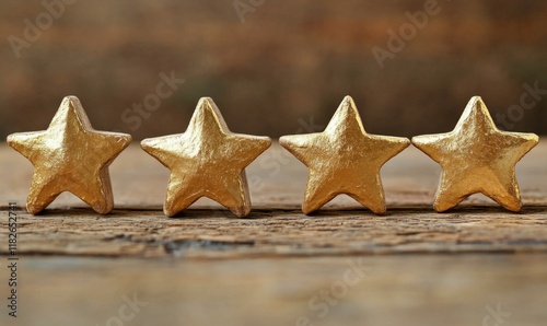 Set of five gold stars on wooden blocks as decorations or rewards.