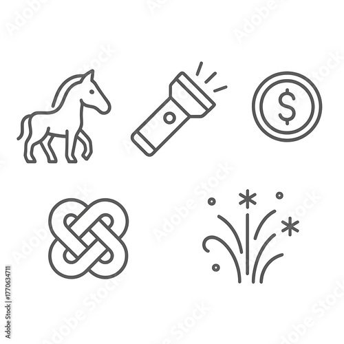 Set of five outline icons: horse, flashlight, dollar coin, decorative knot, fireworks. Thin line, monochrome, isolated on white. design for UI, apps and web