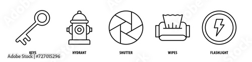 Set of Flashlight, Wipes, Shutter, Hydrant, Keys icons, a collection of clean line icon illustrations with editable strokes for your projects